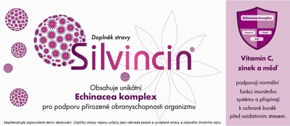 Silvincin® je doplněk stravy s obsahem Echinacea komplexu (suchého extraktu z Echinacea angustifolia a Echinacea purpurea), vitamínu C, zinku a mědi.