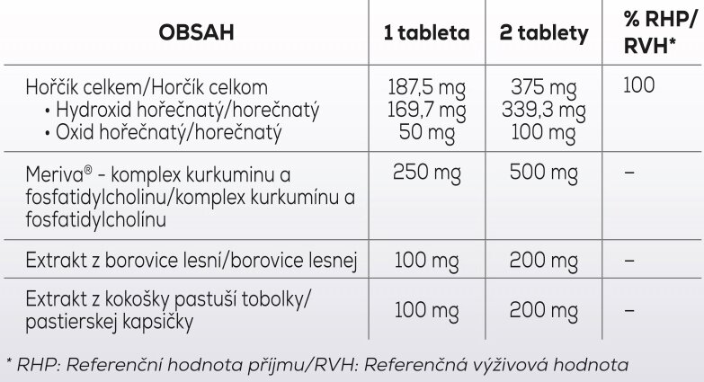 Hydroxid hořečnatý; objemové činidlo: mikrokrystalická celulóza; Meriva® - komplex kurkuminu a fosfatidylcholinu (Curcuma longa L., oddenek, suchý extrakt, sójový lecitin) tit. 18-22 % kurkuminoidů; oxid hořečnatý; borovice lesní (Pinus sylvestris L., kůra, suchý extrakt tit. 95 % proanthokyanidinů), Kokoška pastuší tobolka (Capsella bursa-pastoris (L.) Medik., bylina, suchý extrakt); protispékavé látky: zesíťovaná sodná sůl karboxymethylcelulózy, hořečnaté soli mastných kyselin, oxid křemičitý; leštící látky: hydroxypropylmethylcelulóza, mikrokrystalická celulóza, kyselina stearová.