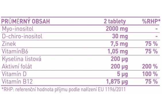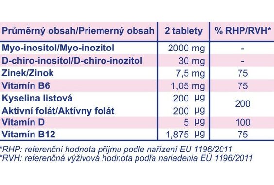 Myo-inositol; plnidlo: celulóza; glukonan zinečnatý; protispékavé látky: oxid křemičitý, hořečnaté soli mastných kyselin; d-chiro-inositol; vitamin D (cholekalciferol); vitamin B12 (kyanokobalamin); vitamin B6 (pyridoxin-hydrochlorid); aktivní folát (L-methylfolát vápenatý); kyselina listová (kyselina pteroylmonoglutamová).