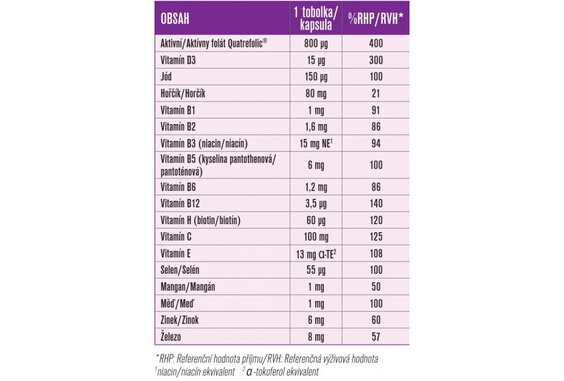 Oxid hořečnatý; vitamín C (kyselina L-askorbová); jedlá želatina; plnidlo: fosforečnan vápenatý; kvasnice obohacené selenem; vitamín E (DL-α-tokoferyl-acetát); fumarát železnatý; vitamín B3 - niacin (nikotinamid); protispékavé látky: oxid křemičitý, horečnaté soli mastných kyselín; glukonan manganatý; oxid zinečnatý; glukonan měďnatý; vitamín B5 (D-pantothenan vápenatý); vitamín D3 (cholekalciferol); vitamín B12 (kyanokobalamin); aktivní folát Quatrefolic® (glukosaminová sůl kyseliny (6S)-5-methyltetrahydrolistové); vitamín B6 (pyridoxin-hydrochlorid); vitamín B2 (riboflavin); vitamín B1 (thiamin-hydrochlorid); jodid draselný; vitamín H (D-biotin).