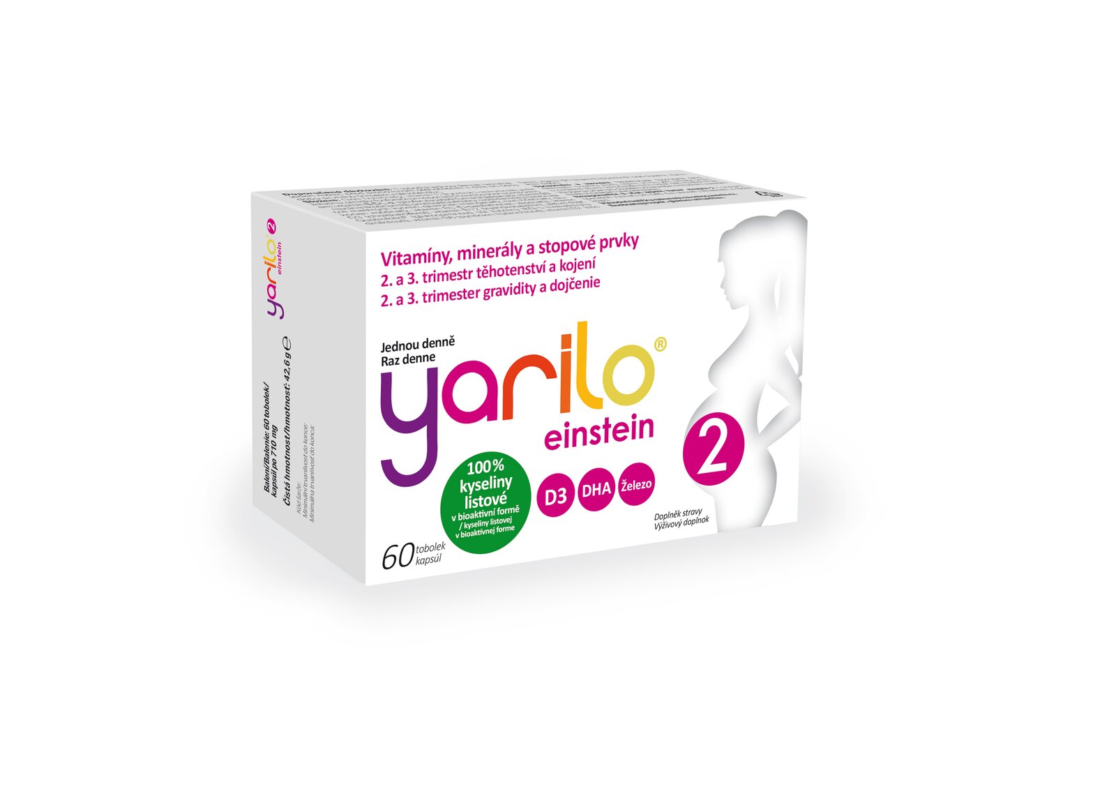 Yarilo® einstein 2 obsahuje 600 µg plně biologicky aktivního folátu nejnovější generace. Na rozdíl od obyčejné kyseliny listové je okamžitě účinný a nemusí se metabolizovat pomocí enzymu MTHFR. Při užívání 100 % čistého aktivního folátu se v organizmu neobjevuje nemetabolizovaná kyselina listová (UMFA – unmetabolised folic acid).Folát se podílí na dělení buněk a podporuje také růst zárodečných tkání v těhotenství. Jedna tobolka Yarilo® einstein 2 obsahuje 200 mg omega-3 DHA (kyselina dokosahexaenová). Jelikož je DHA získaná z řas, nemá pachuť typickou pro rybí tuk. Podávání DHA během těhotenství a kojení podporuje správnou hladinu DHA matky a v jejím mateřském mléce. DHA přijímaná matkou podporuje normální vývoj mozku a očí plodu i kojence. Příznivého účinku se dosáhne při příjmu nejméně 200 mg DHA denně nad rámec doporučené denní dávky omega-3 mastných kyselin pro dospělé (250 mg DHA a EPA).